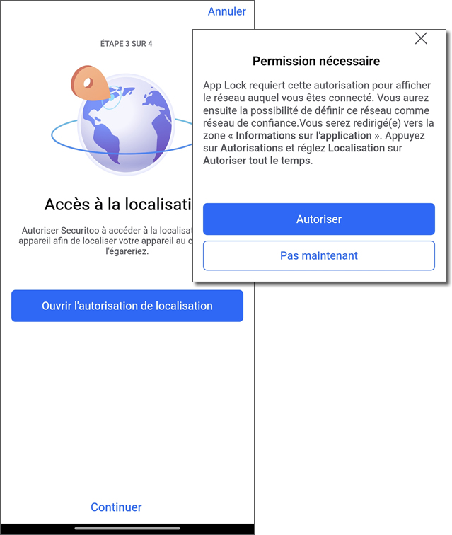 8. Pour utiliser le déverrouillage intelligent, autorisez l'accès à la localisation. Pour ce faire, appuyez sur Ouvrir l'autorisation de localisation pour afficher le réseau auquel vous êtes connecté, puis sur Autoriser dans la fenêtre qui suit.