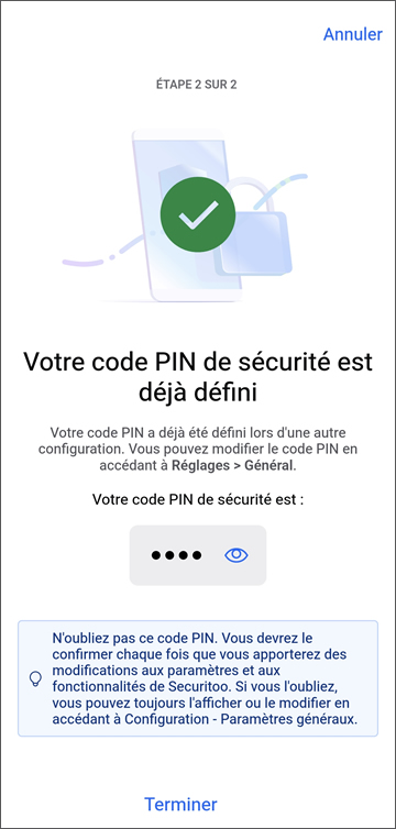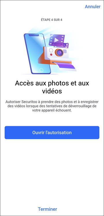 6. Pour permettre à Securitoo de capturer des photos et d’enregistrer des vidéos en cas de tentatives de déverrouillage infructueuses de votre appareil, appuyez sur Terminer.