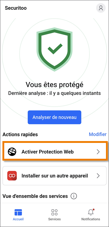 Depuis l'écran d'accueil de l'application Securitoo, cliquez sur Activer protection Web.