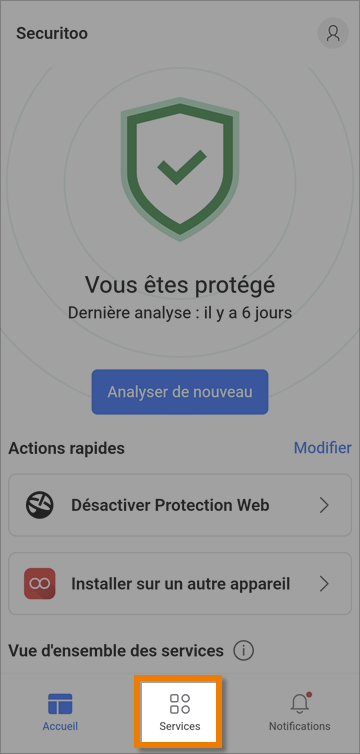 1. Depuis l'écran d'accueil de l'application Securitoo, appuyez tout en bas sur le menu Services.