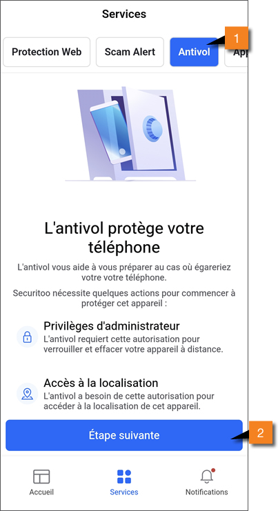 2. Balayez les onglets vers la droite afin d'atteindre la fonctionnalité Antivol 1, puis appuyez sur le bouton Etape suivante 2.