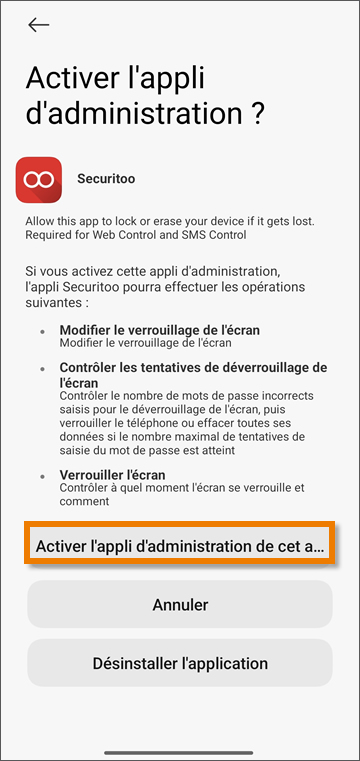 4. Appuyez ensuite sur Activer l'appli d'administration de cet appareil.