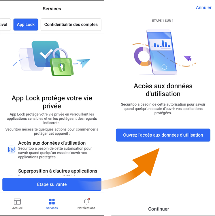 2. App Lock nécessite l'accès aux données d'utilisation. Appuyez sur Etape suivante, puis sur Ouvrez l'accès aux données d'utilisation (pour connaître les autorisation en détail) ou simplement sur Continuer