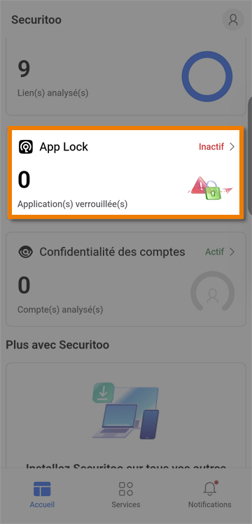 1. Depuis l'écran d'accueil de l'application Suite de Sécurité Sécuritoo, faites défiler l'écran vers le bas, choisissez App lock puis activez le module.