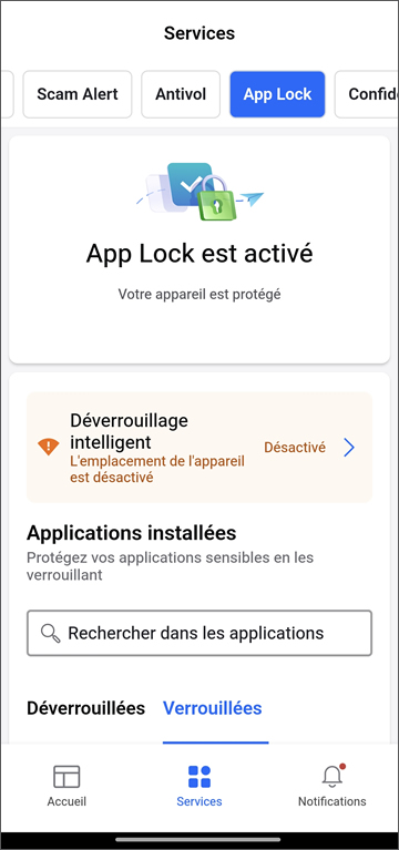 7. Le module App Lock est désormais activé ! Pour en tirer le meilleur parti, activez la fonction Déverrouillage intelligent. Grâce à cette option, vous pouvez désigner un réseau Wi-Fi comme réseau de confiance, ce qui vous permettra de déverrouiller les applications concernées sans avoir à saisir de code PIN.