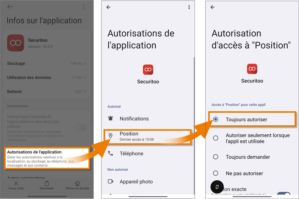 9. Depuis « Infos sur l'application », appuyez sur Autorisation de l'application, puis sur Position et enfin cochez la case « Toujours autoriser »