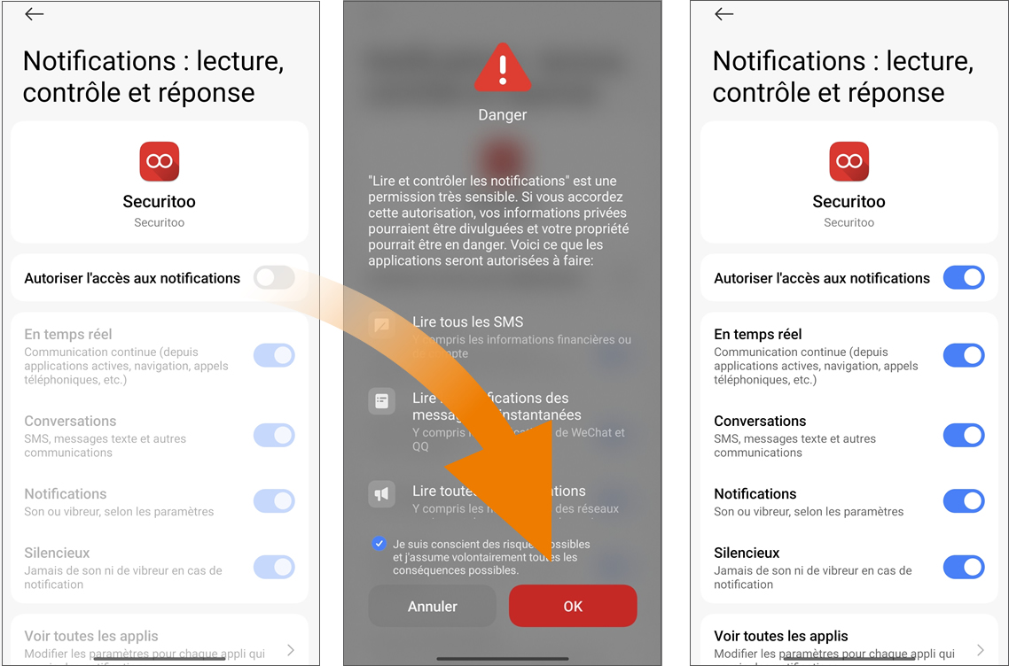 5. Autorisez ensuite la Protection des conversations en ligne, pour ce faire activer l'autorisation d'accessibilité : Cliquez sur le bouton Activer 1, puis après avoir lu les avertissements indiqués dans la fenêtre ci-dessous, cochez la case "Je suis conscient..." 2 , puis appuyez sur le bouton OK 3.