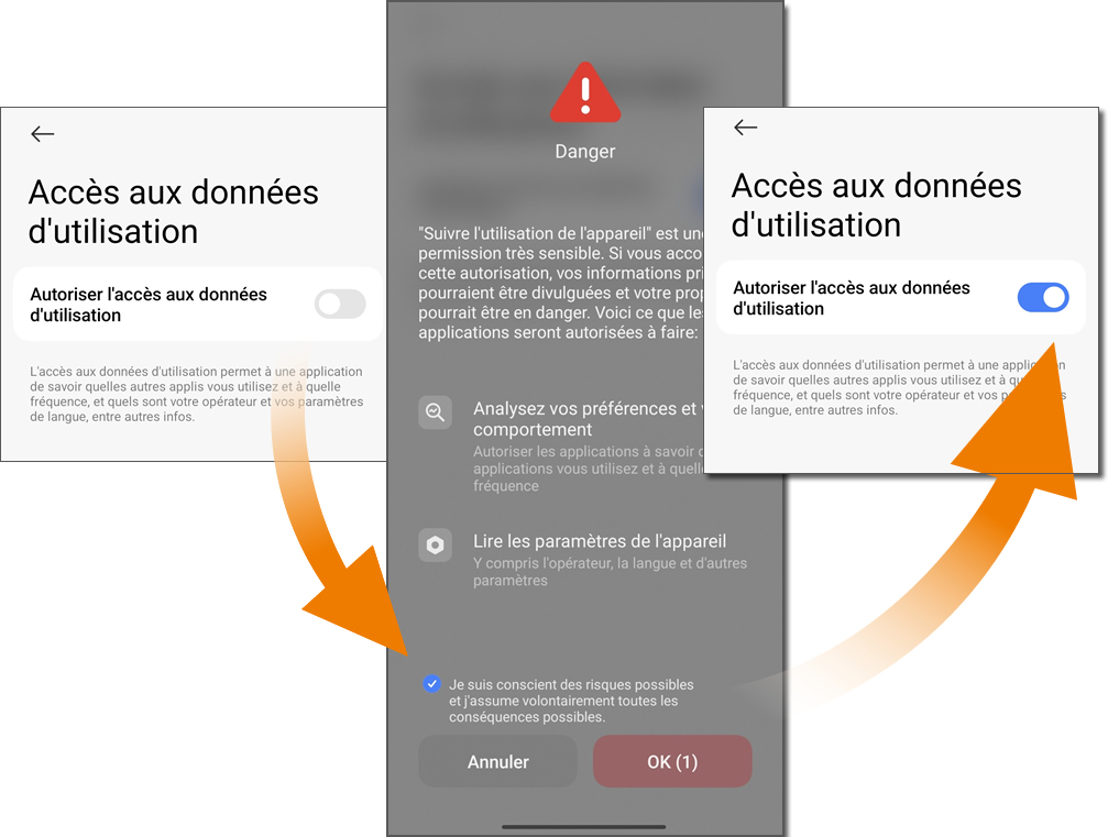 4. Basculez l'interrupteur vers la droite pour autoriser l'accès aux données d'utilisation : Après avoir lu les avertissements indiqués dans la fenêtre ci-dessous, cochez la case "Je suis conscient...", puis appuyez sur le bouton OK.