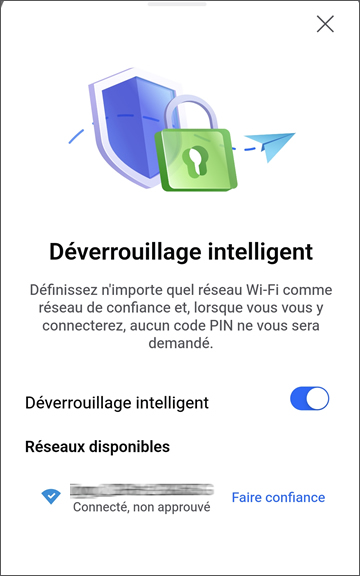 Le déverrouillage intelligent est désormais activé. Lorsque un réseau Wi-Fi de confiance sera à portée (votre domicile, travail...), sélectionnez le, puis appuyez sur Faire confiance.