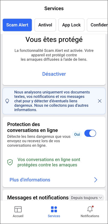 Scam Alert permet de vous protéger contre les liens dangereux reçus dans les SMS, applications de messagerie de manière proactive en vous notifiant dès leur réception.