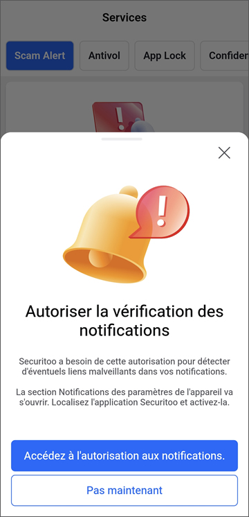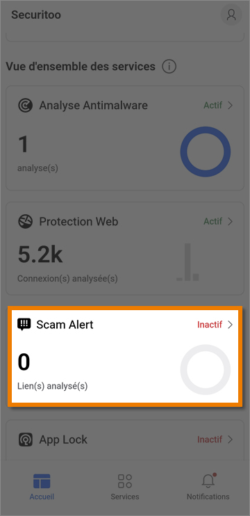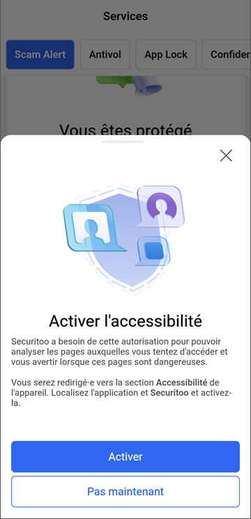 1. Depuis l'écran d'accueil de l'application Securitoo, faites défiler l'écran vers le bas, choisissez Scam Alert puis activez le module.