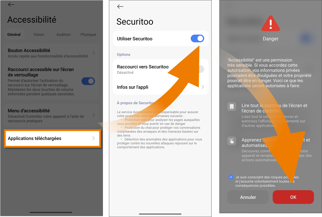 6. Depuis « Accessibilité », choisissez Applications téléchargées, puis sélectionnez Securitoo, Après avoir lu les avertissements indiqués dans la fenêtre ci-dessous , cochez la case "Je suis conscient...", puis appuyez sur le bouton OK 2.et faites glisser le curseur vers la droite pour activer la fonction Utiliser Securitoo.