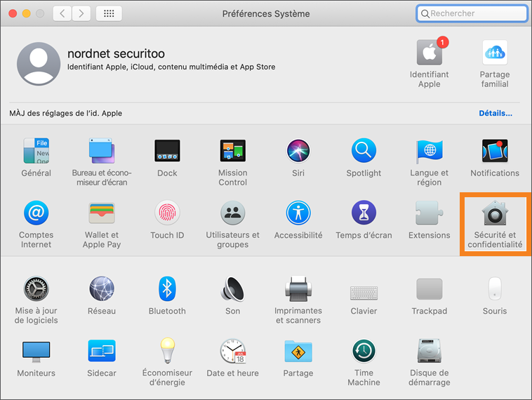 Depuis le Dock, cliquez sur l'icône Préférences Système  puis sur Sécurité et confidentialité