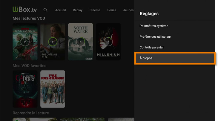 de la télécommande pour accéder au menu Réglages, puis sélectionnez A propos et validez.
