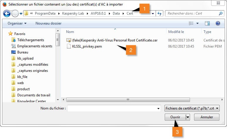 6. Accédez au dossier C:\Program Data\Kaspersky Lab\AVP16.0.0\Data\Cert 1, sélectionnez le fichier (fake) Kaspersky Anti-Virus Personal Root certificate.cer 2 et cliquez sur Ouvrir 3.