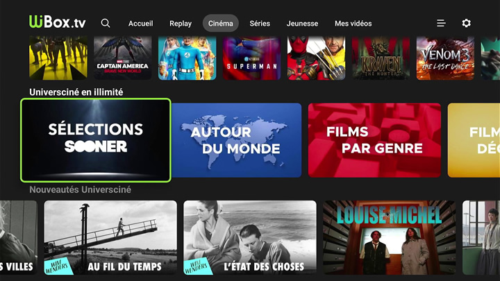 L’accès à vos films et séries se fait directement depuis le menu principal de l'application WiBox.tv. Vous y trouverez deux types de catalogues de vidéos à la demande :