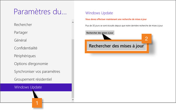 2. Dans la partie gauche, cliquez sur Windows Update 1. Si vous obtenez le message "Vous devez effectuer maintenant une recherche des mises à jour", cliquez dès maintenant sur Rechercher des mises à jour 2, puis rendez-vous au point suivant.